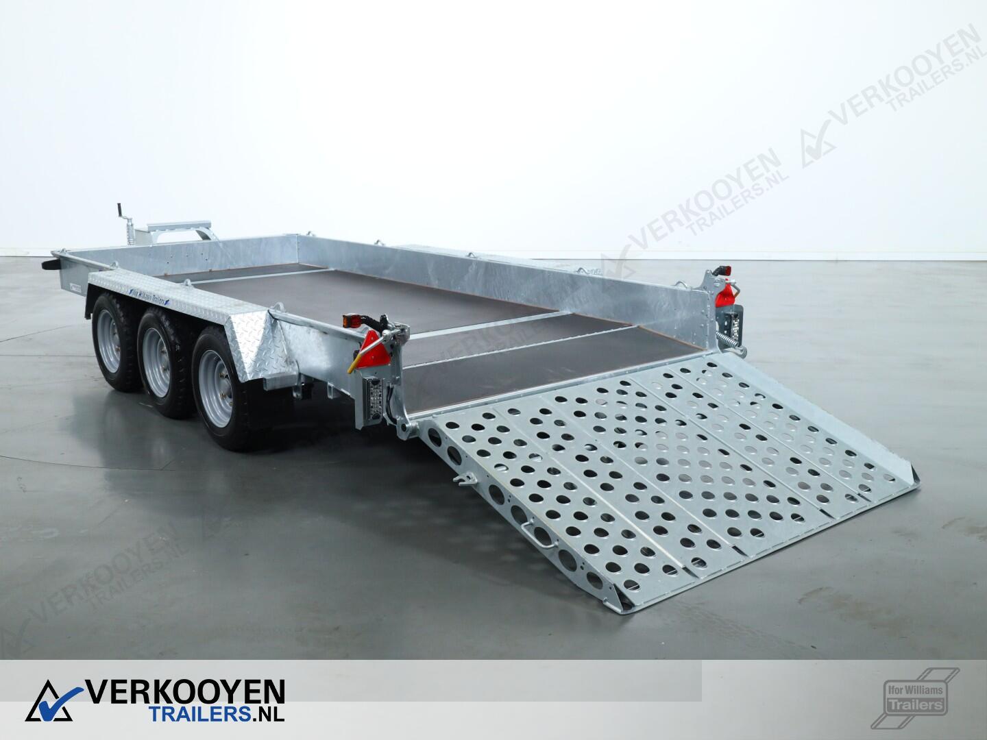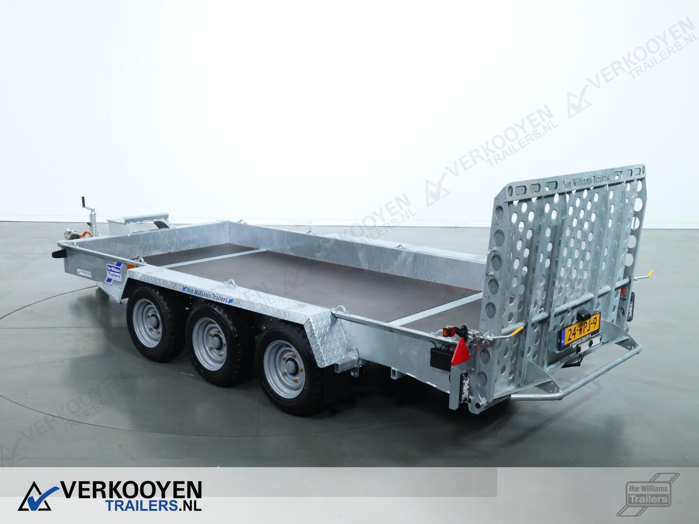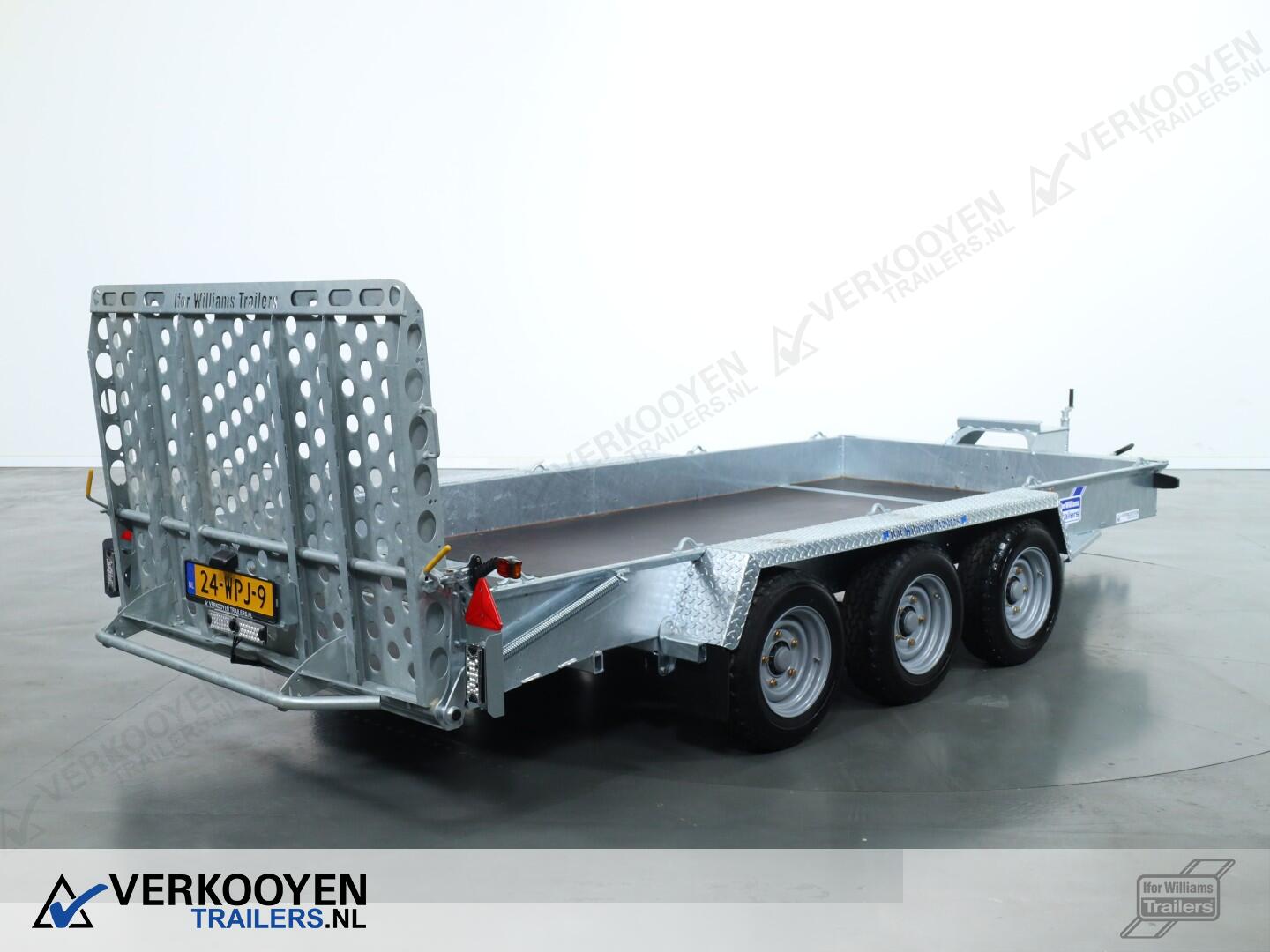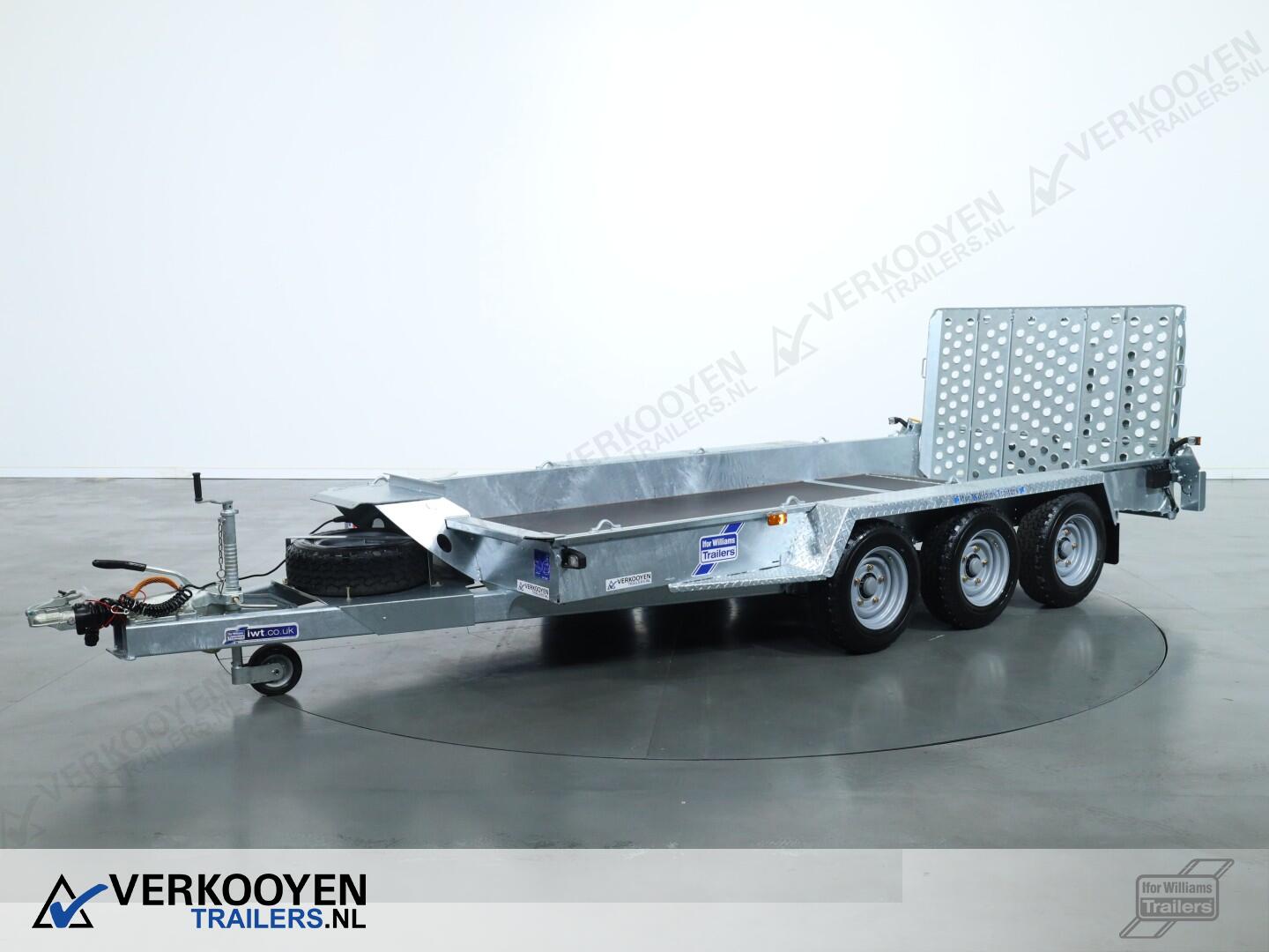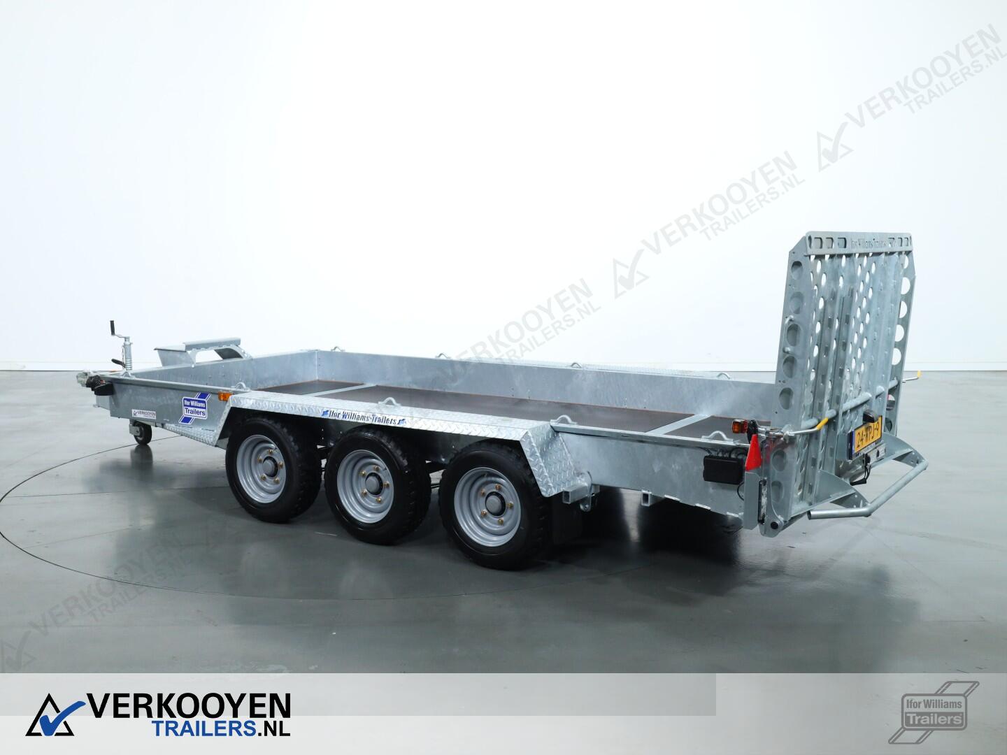 Ifor Williams GH146 machinetransporter. Deze Ifor Williams GH146 3-assige machinetransporter is uitgevoerd met bladgeveerde assen en heeft een maximaal draagvermogen van 3500 kg